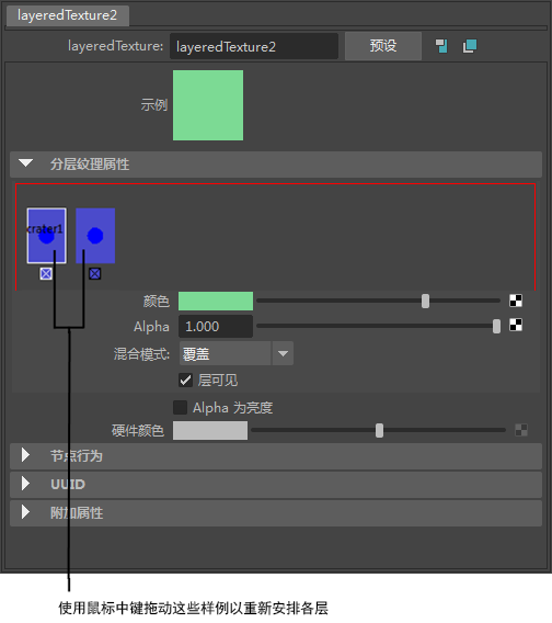 若要重新排列“分层纹理 属性编辑器”(Layered Texture > Attribute Editor)中的层,请使用鼠标中键拖动层样例。