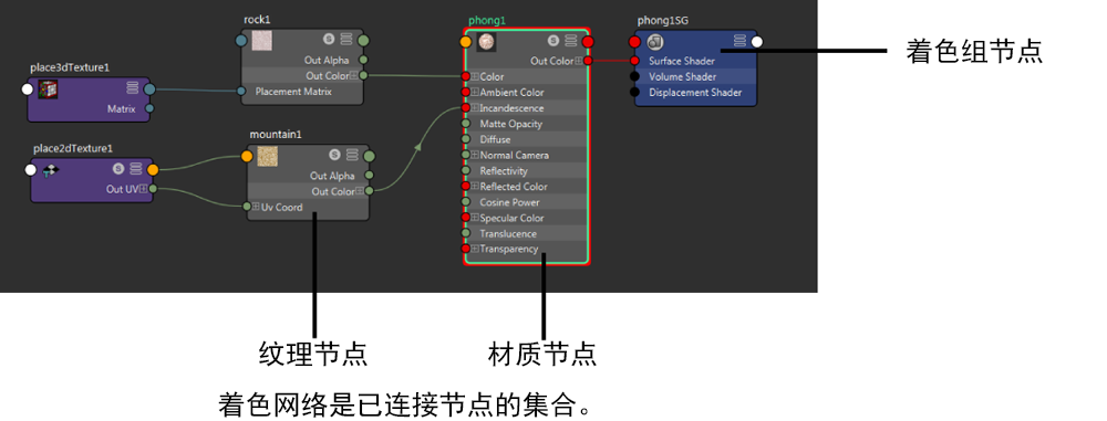 定义材质外观的颜色和纹理可以表示为着色网络。在此示例中,岩石纹理定义 Phong 材质的颜色,而山脉纹理定义白炽度。