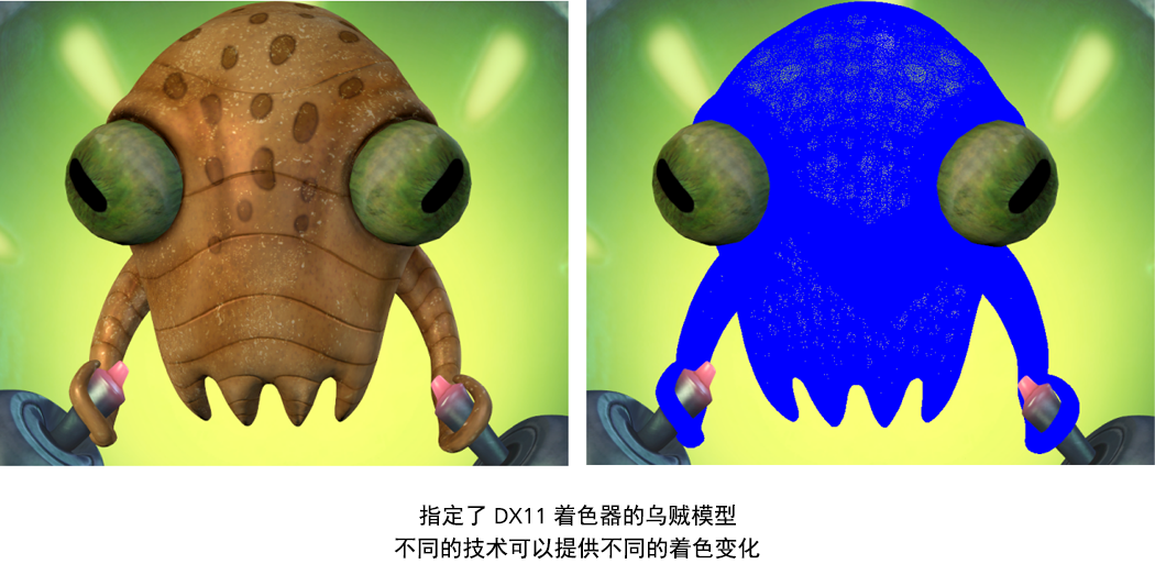 单个效果可以指定一种或多种技术以提供不同的着色变化。Maya 会在“属性编辑器”(Attribute Editor)的下拉列表中显示可用的技术。