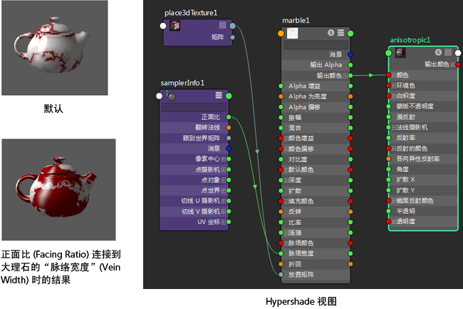 在第一个示例中,将“SamplerInfo”的正面比属性连接到“大理石”(Marble)纹理的“脉络宽度”(Vein Width)。