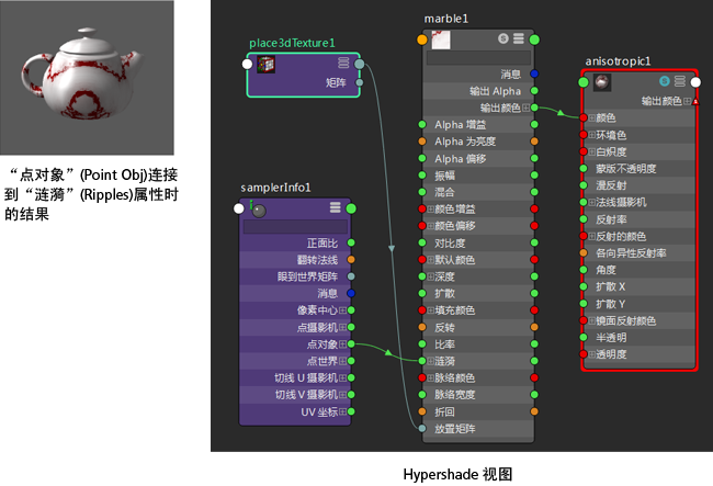 在下面的示例中,将“SamplerInfo”的点对象属性连接到“大理石”(Marble)纹理的“涟漪”(Ripples)属性。