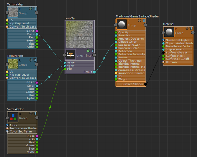 - 将“线性插值混合”(Linear Interpolate Mix)的“结果”(Result)属性连接到“TraditionalGameSurfaceShader”节点的“漫反射颜色”(Diffuse Color)属性。现在,可以在 Viewport 2.0 中对着色器进行可视化。