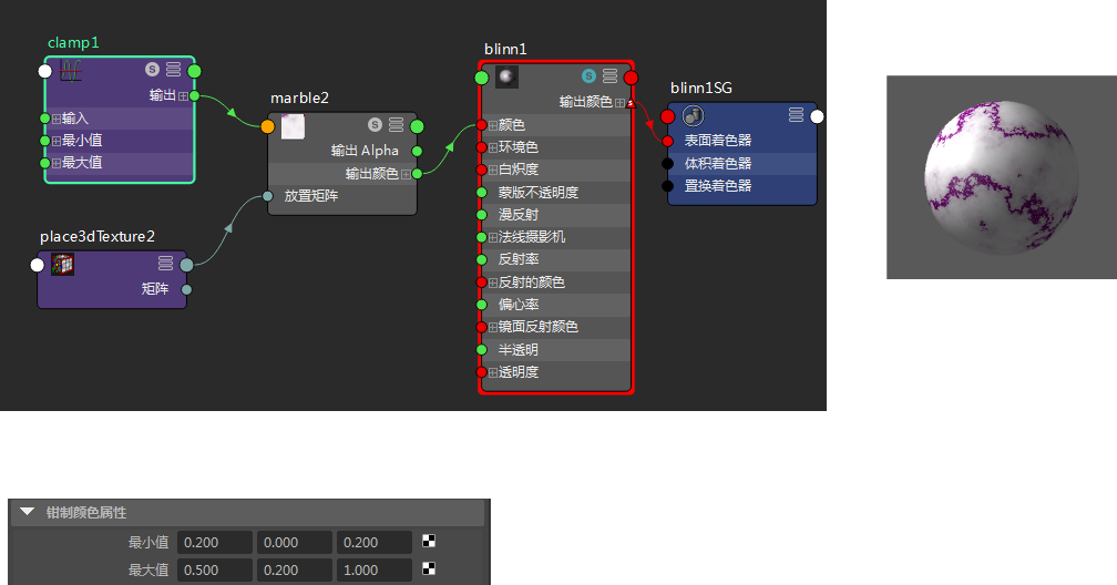 在以下示例中,“钳制”(Clamp)节点已连接到“大理石”(Marble)纹理的“脉络颜色”(Vein Color)。由于 R 和 B 的“最小值”(Min)和“最大值”(Max)设置得比 G 的高,因此“大理石”(Marble)纹理的脉络看起来更红和更蓝。