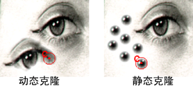 使用动态克隆时,克隆源会随着绘制的进行发生移动。在以下“动态”(Dynamic)“克隆”(Clone)示例中,顶部眼睛的小区域已设置为克隆源。在眼睛下方绘制逐渐复制了顶部的眼睛。在“静态”(Static)“克隆”(Clone)示例中,瞳孔已被克隆并标记。