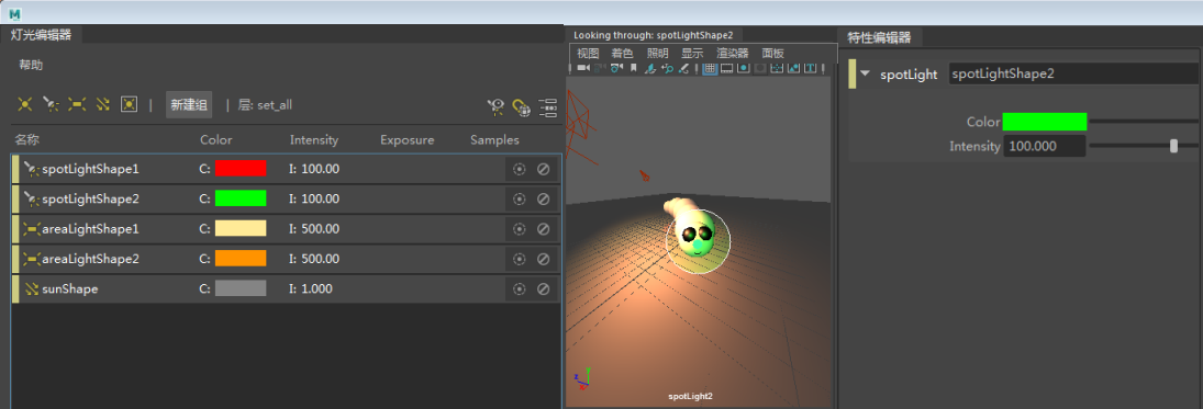 此窗口可以停靠到 Maya UI 中,或者停靠到灯光编辑器工作区中,使其位于灯光属性的上方或下方、左侧或右侧。