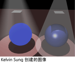 在下一示例中,左侧的球体显示平面 (2D),因为它由“表面着色器”(Surface Shader)着色。请注意,与右侧的球体相比该球体上缺少阴影。右侧的灯光雾显示平面,因为它由“体积着色器”(Volume Shader)着色。请注意,与左侧的灯光雾相比该处缺少体积阴影。