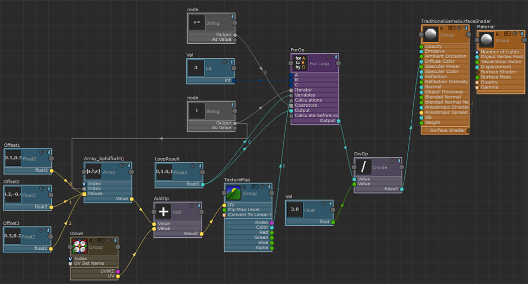 以下示例说明如何使用 for 循环通过不同的 UV 偏移采样纹理三次。将采样值相加,然后除以三,所得平均值应用到“TraditionalGameSurfaceShader”的“漫反射”(Diffuse Color)通道。