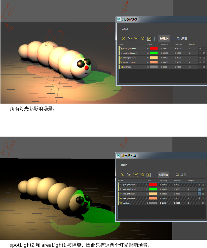 使用灯光编辑器隔离灯光子集,以便只有这些灯光在场景中生效。