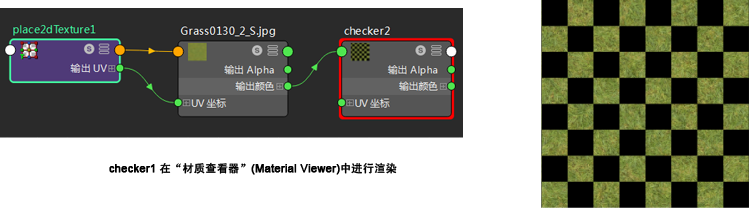 在此示例中,checker1 是在“材质查看器”(Material Viewer)中渲染的。若要在“材质查看器”(Material Viewer)中查看草参考纹理,请单放文件节点。