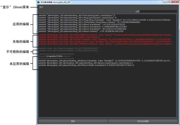 通过“列出集合编辑”(List Assembly Edits)窗口,可以显示对集合引用节点和场景表示包含的节点进行的编辑。使用“显示”(Show)菜单中的选项,可以显示对 assemblyReference 节点层次中的所有节点进行的编辑或仅显示影响选定 assemblyReference 节点的编辑。