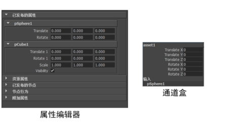 当资源节点自身不显示在场景视图中时,它们会显示在多个编辑器中。此外,如果选择的对象已由场景视图中的资源进行封装,则该资源会与已发布的属性一同显示在“属性编辑器”(Attribute Editor)或“通道盒”(Channel Box)中。有关已发布属性的详细信息,请参见已发布的属性和节点。