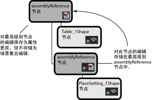 对场景集合层次中较低级别的嵌套节点所进行的更改将存储在顶层级的 assemblyReference 节点中,但该顶层级节点不会存储对其自身属性的编辑。对顶层级节点属性所进行的更改将作为场景文件中的常规属性更改保存,但不会作为场景集合编辑进行存储。