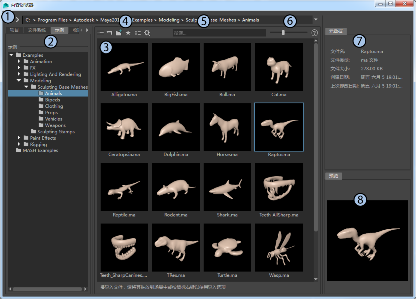 “示例”(Examples)选项卡中提供了 Maya 示例库内容。如果选择以下任意命令,“内容浏览器”(Content Browser)将打开,显示“示例”(Examples)选项卡上的相应采样内容文件夹: