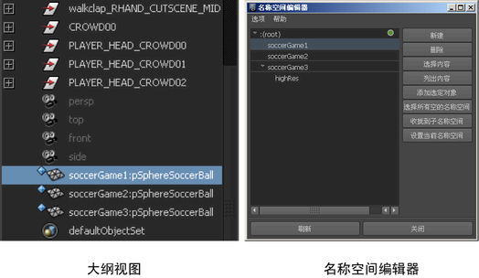 使用名称空间,您可以在同一场景中具有两个名称相同的对象,只要它们包含在不同的名称空间中即可。例如,在场景中,可以有两个名为 pSphereSoccerBall 的对象,但它们使用不同的名称空间 soccerGame1 和 soccerGame2。