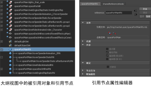 “属性编辑器”(Attribute Editor)将显示关于引用节点的信息,如引用文件路径、其名称空间和共享详细信息。通过单击位于“文件”(File)区域中的图标卸载和重新加载引用。