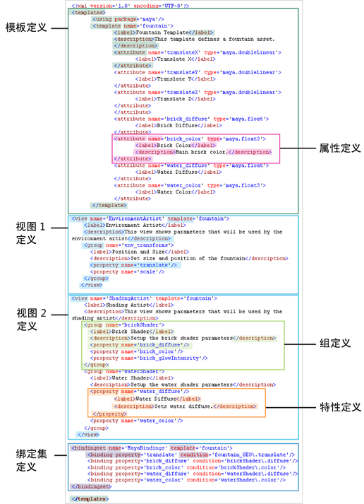 <view name='ShadingArtist' template='fountain'> <label>Shading Artist</label> <description>This view is for the shading team. </description> <group name='Water_Shader'> <property name='water_diffuse'/> <property name='water_color'/> </group> </view>
