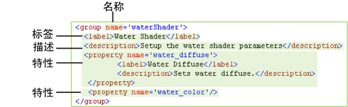 <group name='Brick_Shader'> <label>Brick Shading Properties</label> <description>Control main brick shader.<description> <property name='brick_diffuse'/> <property name='brick_color'/> <property name='brick_transparency'> </group>