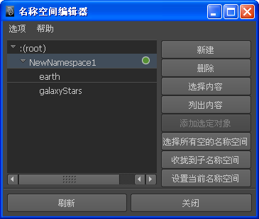 可以在“名称空间编辑器”(Namespace Editor)中、引用文件或将文件导入场景时创建名称空间。如果在引用或导入文件时创建名称空间,默认情况下将文件名用作名称空间。