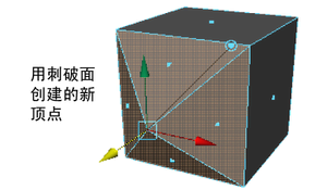 “刺破”(Poke)功能通过以下方式对多边形面进行细分:将新顶点添加到选定面的中心。添加顶点后,将显示操纵器,用于移动新创建的顶点。