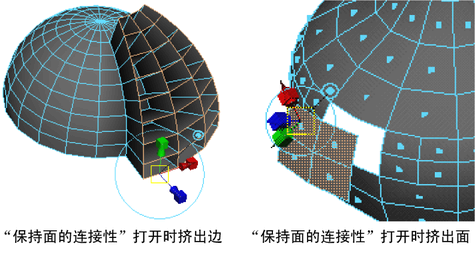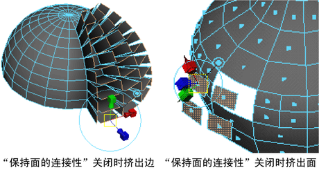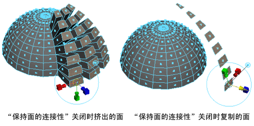 在挤出、提取或复制面时启用或禁用“保持面的连接性”(Keep Faces Together),以指定要保留每个单独面的边还是只沿着当前选择的边界边。