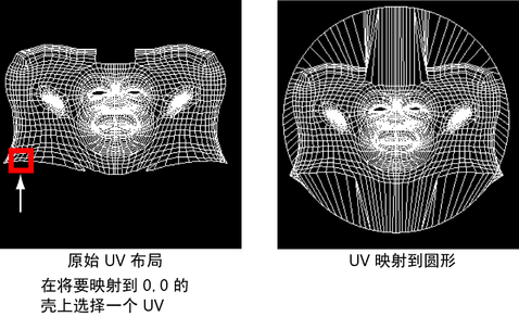 所选择的 UV 非常重要,因为它将决定 UV 壳映射到 UV 纹理空间的 0,0 原点的位置。如果生成的 UV 边界贴图比较倾斜,您可能希望撤消该操作,然后选择另一个 UV 并重新映射。