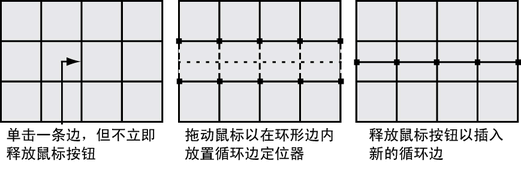 此时在环形边内将显示由点组成的绿色循环边预览定位器线,该线选定垂直于单击的边。释放鼠标按钮后,循环边预览定位器会指示将要沿着网格插入新循环边的位置。