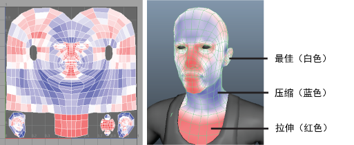 使用扭曲着色器可以轻松确定拉伸或压缩的 UV。通过颜色反馈可以可视化扭曲错误:红色面指示拉伸,蓝色面指示压缩,而白色面指示最佳 UV。