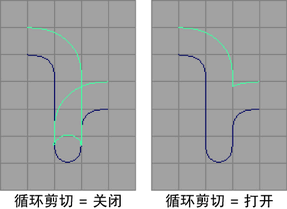 如果启用“循环剪切”(Loop Cutting),则使用“切割半径”(Cutting Radius)值。如果“切割半径”(Cutting Radius)值大于 0,则可以获取指定半径的圆弧,而不是获取已剪切循环位置的尖锐棱角。