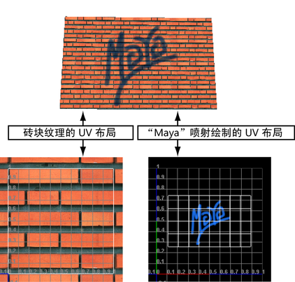 例如,如果创建砖墙,并且需要在顶部分层喷洒绘制,则通过使用分层纹理,可以为砖和绘制分别使用不同的纹理。如果砖纹理重复,但绘制纹理不重复,则每个纹理需使用不同的 UV 布局(UV 集)。