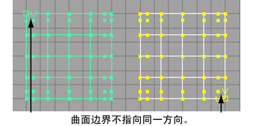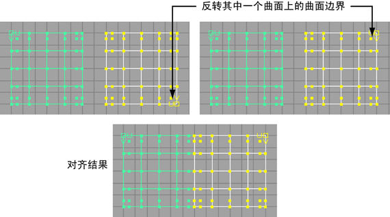 另一种替代方法是,在对齐曲面之前检查曲面的 U/V 方向。使用“曲面 > 反转方向”(Surfaces > Reverse Direction)来反转曲面方向(如有必要)。