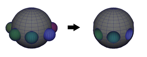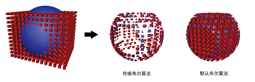 在实例中,布尔可以产生正确且可预测的布尔结果,而 Maya 旧版布尔算法会产生不希望的结果。在以下示例中,将使用两种算法合并一个球体和一组立方体。