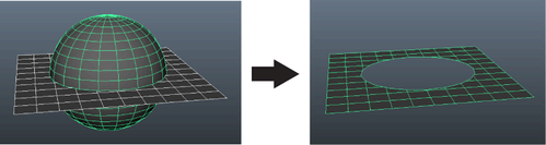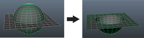 系统会对交集执行布尔操作。使用开放网格(平面或有洞的网格)时,Maya 可以使用两种方式计算选定网格的交集: