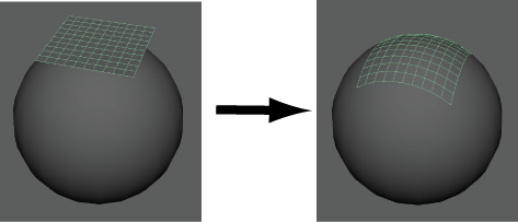 包裹器网格的放置决定了要折绕的目标网格部分。在下面的示例中,球体被放置在世界坐标系原点。平面将折绕到球体的不同部位,具体取决于其原始位置: