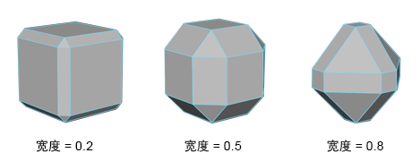如果“偏移类型”(Offset Type)为“分数”(Fractional),则“宽度”(Width)值限制为介于 0 到 1 之间。“宽度”(Width)值为 1 时,该距离将成为可能的最大值(基于最短边),这样将不会产生由内到外的倒角。“宽度”(Width)值大于 1 将产生由内到外的倒角。