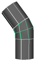 例如,假设已从一对圆柱体创建一个混合曲面,如下图所示。混合曲面为夹在在顶部圆柱体与底部圆柱体之间的弯曲圆柱体:
