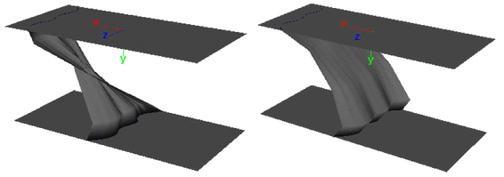 如果“自动设置法线方向”(Auto Normal Dir)处于禁用状态,可使用这些选项,以便更正创建后有异常扭曲的混合曲面。如果启用这些选项中的任一选项,混合曲面将做出响应,就像您正在对连接混合变形与曲面的曲线进行方向反转一样。(实际上,曲线并未反转。)通过在“属性编辑器”(Attribute Editor)中试用这些设置,可解开混合曲面的扭曲。