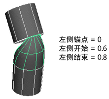 使用“左侧/右侧定位”(Left/Right Anchor)为曲线设置定位位置(在 U 中),混合图形从该曲线创建。这与“左侧/右侧开始”(Left/Right Start)或“左侧/右侧结束”(Left/Right End)一起使用来指定曲线长度范围,沿着该曲线,混合曲面与相邻曲面相交。请注意,还可使用“显示操纵器工具”(Show Manipulator Tool)来调整此选项。请注意,旋转相邻曲面时仍会发生扭曲。