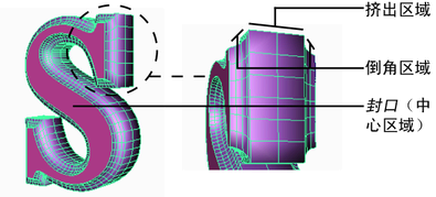若想使倒角区域中的细分曲面间的空间与挤出区域中的细分曲面间的空间不同,则可使用此选项。启用“截面”(Section)后,可分别对倒角曲面各截面进行细分:前倒角区域、后倒角区域和未倒角挤出区域。各截面拥有的细分数与“采样数”(Samples)设置中规定的相同。