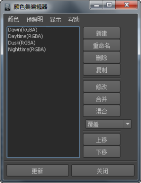 “颜色集编辑器”(Color Set Editor)仅列出当前选定网格的颜色集。如果选定多个网格,则可以使用“颜色集编辑器”(Color Set Editor)对网格上具有相同名称的所有集进行编辑。例如,场景中所有网格可能都有日间和夜间的颜色集。