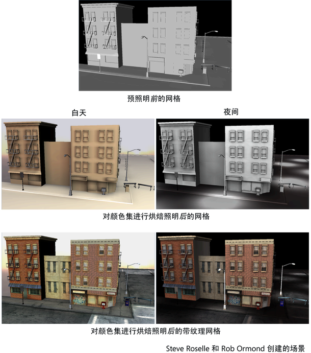 例如,可以通过将场景中的每个多边形网格的日间照明烘焙到一个颜色集,然后将夜间照明烘焙到另一个颜色集,从而预照明场景。有关预照明的详细信息,请参见预照明多边形。