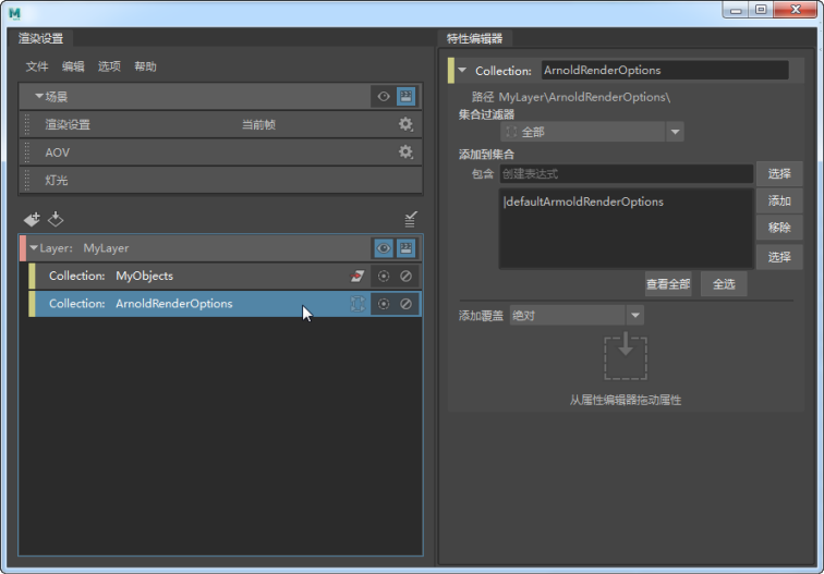 - 创建一个集合,然后将 defaultArnoldRenderOptions 节点添加到其中。