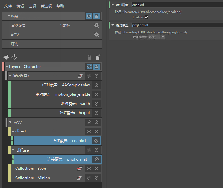 在此示例中,选择“文件 > 导出可见层 AOV”(File > Export Visible Layer AOVs)将创建 .json,其中直接 AOV 处于禁用状态,“Png 格式”(Png Format)设置为 int16(对于漫反射 AOV)。换句话说,覆盖值应用于导出的预设。