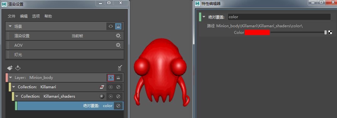 为了开始阐述此示例,我们已为 Mesh_Killamari_Body 应用 blinn7(橙色),已为 Mesh_Killamari_Eyes 应用 phong1(绿色)。已创建渲染层 Minion_body,其中包含一个名为 Killamari 的集合。