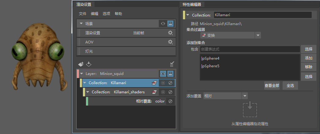 在本示例中,乌贼的身体和每只眼睛均已连接到 Blinn 着色器,其颜色属性连接到了文件纹理。从“添加覆盖”(Add Override)下拉列表中选择“相对”(Relative),然后将“颜色”(Color)属性从 Blinn 的“属性编辑器”(Attribute Editor)拖放到“特性编辑器”(Property Editor)。