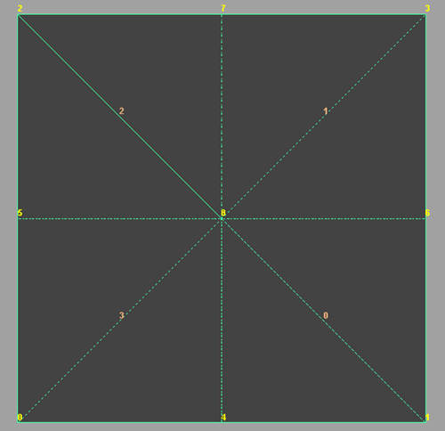 The figure above shows a base face (left image) and the start and winding order of the subdivided faces and vertices when 1 level of subdivision is applied (center and right images).