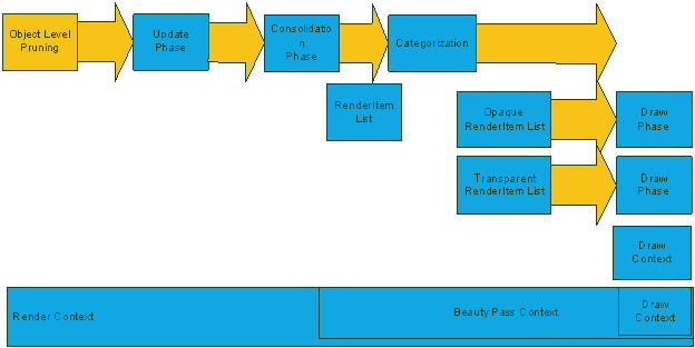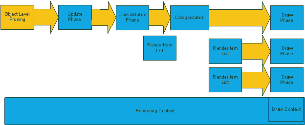 With these additional concepts, we can extend the previous pipeline description with the notion of rendering and draw contexts, collections of renderable objects as lists, and add a Categorization phase:
