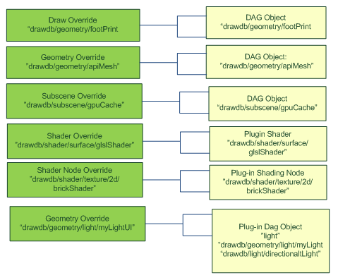 For draw, shader, shading node, geometry and sub-scene overrides, the association is implicitly provided via the use of node classification strings. Override classification and Maya node/object classification matching forms this implicit link. The matching is performed hierarchically from broad to specific via the usage of “sub-classifications.”