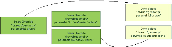 Figure 36: Example demonstrating that, depending on how on how specific the classification is, different matches results. The “drawdb/geometry/parametricSurface/B-spline” DAG object classification matches more closely to the override with the identical classification string, rather than the more generic “drawdb/geometry/parametricSurface” string. The classification with the closest match is used.