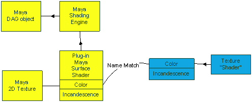 Internally, the mapping could be as follows, where the match is made to an internal shader. The mapping on “color” equates to using an internally specified “shader” to support rendering the textures.
