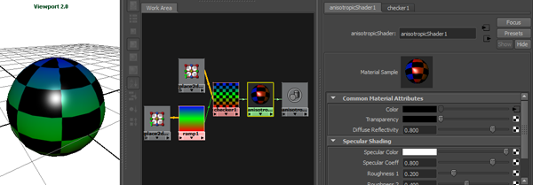 In the image below, a plug-in “anisotropicShader” node is the surface shader assigned to the sphere in the scene. This plug-in is shipped as part of the Developer Kit and does not require any modification in order to be achieve a minimal level of support using this automatic system. The “color” and “specularColor” attributes are recognized, as are the input connections. The upstream checker and ramp textures are thus natively supported in hardware the same way they would be if they were connected to an internally provided shader.